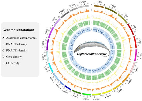 In total, 96,078,789 bp of tandem repeats were predicted using TRF, accounting for approximately 12.16% of the genome. A total of 277,525,905 bp of interspersed repeats were identified by integrating the results of database mapping and ab initio prediction, accounting for approximately 35.13% of the genome (Supplementary Table S3). Annotation of nc-RNAs showed that the L. savala genome had 1434 miRNAs (143,870 bp; 0.0182%), 9086 tRNAs (685,943 bp; 0.0868%), and 10,263 rRNAs (2,100,089 bp; 0.27%) (Supplementary Table S4).