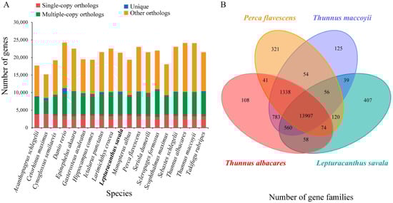 Types and numbers of gene families in 19 species (A) and quantitative analysis of gene families in L. savala, T. albacares, T. maccoyii, and P. flavescens (B).