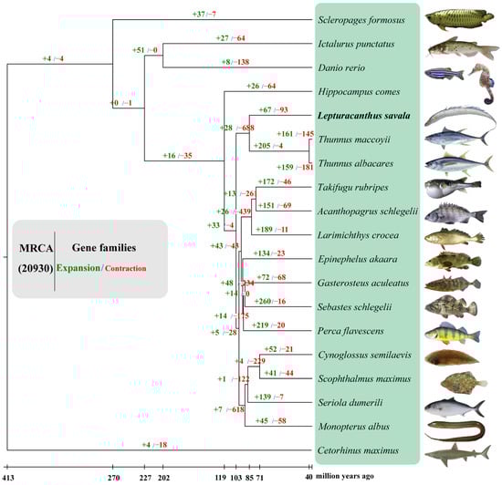 Protein-coding genes of less than 30 amino acids in the genomes of L. savala and 18 other fishes (Acanthopagrus schlegelii, C. semilaevis, D. rerio, Epinephelus akaara, G. aculeatus, H. comes, Ictalurus punctatus, L. crocea, Monopterus albus, P. flavescens, Seriola dumerili, Scleropages formosus, Scophthalmus maximus, Sebastes schlegelii, T. albacares, T. maccoyii, T. rubripes, and Cetorhinus maximus) were removed, and alternative splicing of the longest transcript was used for a gene family cluster analysis. Similarity relationships between the protein sequences of these 19 species were calculated by Blastp [56] (E-value = 1 × 10−7). Based on similarity, orthologous genes from 19 species were clustered using OrthoMCL v2.0.9 [68] (extension coefficient = 1.5) to obtain single-copy gene families and multi-copy gene families. Then, the expansion and contraction of gene families were evaluated using CAFE (http://sourceforge.net/projects/cafehahnlab/, accessed on 25 March 2022). Further, GO and KEGG pathway enrichment analyses of expanded and contracted gene families were carried out using BioSciTools (https://bioscitools.github.io, accessed on 25 March 2022) with p < 0.05 and FDR (false discovery rate) < 0.05 as thresholds for statistical significance. Gene families detected only in L. savala and not in other species were considered to be unique to L. savala.
