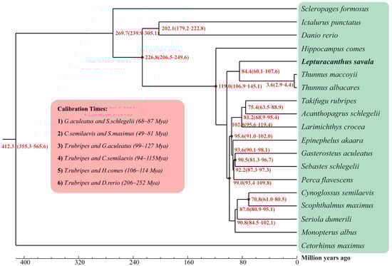 As illustrated in the phylogenetic trees (Figure 5 and Figure 6), L. savala, T. albacares (BioProject: PRJEB47267), and T. maccoyii (BioProject: PRJEB46021) were first clustered into a monophyletic clade with 100% bootstrap support, and all nodes of other branches also showed 100% support. As shown in Figure 6, the divergence between L. savala with T. maccoyii and T. albacares occurred 84.4 (60.1–107.6) million years ago, while T. maccoyii and T. albacares diverged 3.6 (2.9–4.4) million years ago.