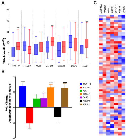 Changes in the gene expression of representative HR components in neoplastic colorectal specimens and matched healthy tissues. (A) mRNA levels (mean ± SEM). Blue boxplots represent normal tissues and red boxplots represent colorectal tumors. (B) Fold change between neoplastic and normal tissues (mean ± SEM). (C) Heatmap showing the individual gene expression fold changes of key HRR components in colorectal tumors. Blue represents the expression ≤ median = low; red represents the expression > median = high; gene expression means between normal and neoplastic tissues and fold changes were compared using Mann–Whitney’s test and Wilcoxon test, respectively; * p < 0.05; *** p < 0.001; **** p < 0.0001.