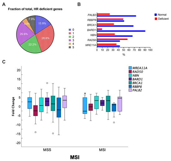 Characterization of HR profiles in CRC patients. (A) Proportions of patients according to the number of deficient HR genes in tumor samples (fold change > −2.0); (B) proportions of each HR gene according to normal or deficient expression; (C) boxplots of HR gene fold change means according to MMR status. T-test for equality means. * p (two-sided) < 0.05; the circles represent the outliers.