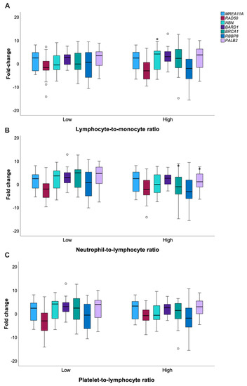 Fold changes of HR representative genes according to composite inflammatory blood indexes. T-test for equality means. * p < 0.05; the circles represent the outliers (A). Lymphocyte-to-monocyte ratio; (B). Neutrophil-to-Lymphocyte ratio; (C). Platelet-to-lymphocyte ratio.
