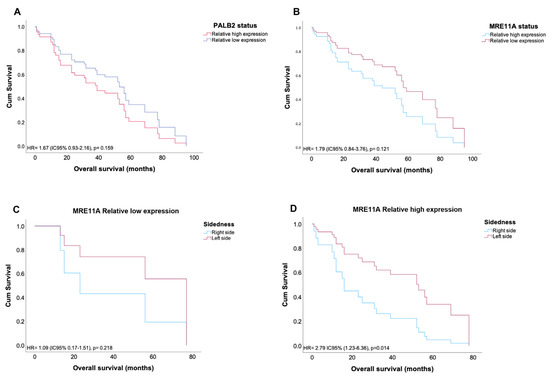 Kaplan–Meier plots of Cox regression for progression free survival of CRC patients. Survival curves of (A) PALB2; (B) MRE11A; (C) MRE11A, relative low expression adjusted for sidedness; and (D) MRE11A, relative high expression adjusted for sidedness.