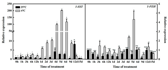 Expression of 1-SST and 1-FEH at different stages of low-temperature stress. Different letters in the same panel indicate statistical significance (p < 0.05).