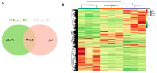 Differential expression gene analysis map. (A) Venn diagram of the differentially expressed genes identified in the two treatments. (B) Transcriptional heat map of TDT1, TDT5, and TCK.