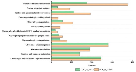 To further understand the function of carbohydrate differential expression genes involved in response to low-temperature stress and their main signal pathways, KEGG pathway analysis was conducted to screen the DEGs (Figure 3). For TCK_vs_TDT5 (compared to the untreated control group on the fifth day of low-temperature stress), the starch and sucrose metabolism (ko00500) pathways were enriched with the largest number of DEGs followed by the glycolysis/gluconeogenesis (ko00010) and amino sugar and nucleotide sugar metabolism (ko00520) pathways, but the number of DEGs in these two pathways was equal in TCK_vs_TDT1 (compared to the untreated control group on the first day of low-temperature stress) and TCK_vs_TDT5. Among these, the same number of DEGs in the two periods were associated with galactose metabolism (ko00052) and fructose and mannose metabolism (ko00051). In addition, for TCK_vs_TDT5, the metabolism of starch and sucrose (ko00500), pentose phosphate pathway (ko00030), mutual transformation of pentose and glucuronide (ko00040), degradation of other glycans (ko00511), glycosylphosphatidylinositol (GPI)-anchored biosynthesis (ko00563), sphingolipid biosynthesis ganglion series (ko00604), and glycosaminoglycan degradation (ko00531) were annotated in TDT5. The number of differential expression genes was more than that of TCK_vs_TDT1, and other types of O-glycine biosynthesis (ko00514) and N-sugar chain biosynthesis (ko00510) were only found in TCK_vs_TDT5. These results indicate that the number of DEGs in different carbohydrate metabolism pathways increased with the extension of stress time.