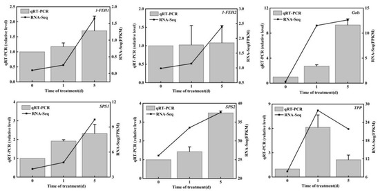 To confirm the accuracy and repeatability of the RNA-seq results, we randomly screened 10 key genes of carbohydrate metabolism and performed qRT–PCR validation. The expression patterns of six genes were consistent with the changes in FPKM values (Figure 4). These results indicate the reliability of the RNA-seq data.