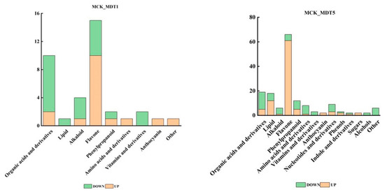 After exposure to low-temperature stress, the metabolites of garlic seedlings changed significantly. A total of 795 metabolites (Table S4) were detected in MCK (control group without low-temperature stress treatment), MDT1 (low-temperature stress treatment for 1 d), and MDT5 (low-temperature stress treatment for 5 d). Among them, 626 metabolites did not respond to cold stress (Table S5). Screening conditions of fold change ≤ 0.5 and VIP ≥ 1 were selected to identify differential expression metabolites. Compared with the control (MCK), 37 metabolites accumulated differently after 1 d of low-temperature treatment (MDT1), of which 17 metabolites increased, and 20 decreased. The main metabolites mainly included organic acids and derivatives, lipids, alkaloids, flavonoids, phenylpropanoid, amino acids and derivatives, and vitamins and derivatives. Compared with the control (MCK), 158 metabolites accumulated differently after 5 d of low-temperature treatment (MDT5), among which 95 metabolites increased, and 63 decreased. Compared with the control (MCK), nucleotides and their derivatives, phenols, indoles and their derivatives, alcohols, and sugars increased (Figure 5).