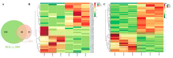 Differential expression metabolite analysis graph. (A) Venn diagram of differential expression metabolites. (B) Metabolic heat map of MCK and MDT1. (C) Metabolic heat map of MCK and MDT5.