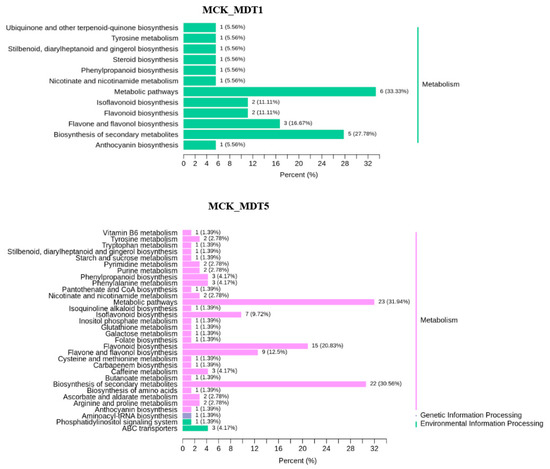 Differential expression metabolite KEGG classification map. MCK_vs_MDT1: Compared to the untreated control group on the first day of low-temperature stress; MCK_vs_MDT5: Compared to the untreated control group on the fifth day of low-temperature stress.