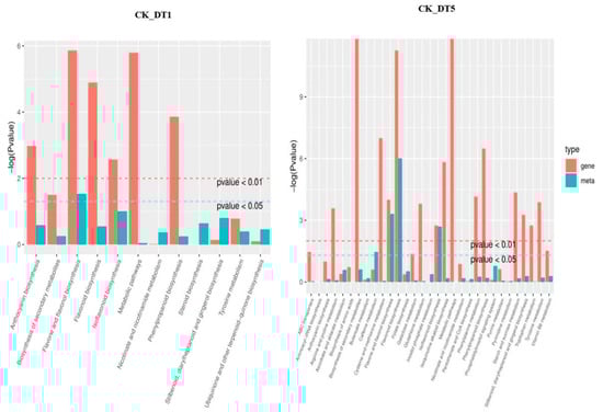 KEGG enrichment analysis p-value histogram. Gene represents differentially expressed genes; meta represents differential expression metabolites; CK_vs_DT1: Compared to the untreated control group on the first day of low-temperature stress; CK_vs_DT5: Compared to the untreated control group on the fifth day of low-temperature stress.
