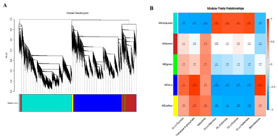 Transcriptomic and metabolomic correlation analyses. (A) Module hierarchical clustering tree graph. (B) Correlation between gene modules and carbohydrate metabolites.