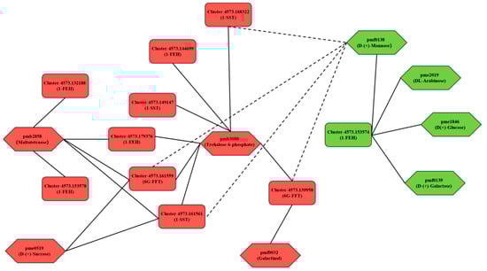 Correlation network of key genes of fructan metabolism and carbohydrate metabolites under low temperatures. The solid line represents a positive correlation, and the dotted line represents a negative correlation. Red indicates upregulated expression, and green indicates downregulated expression.