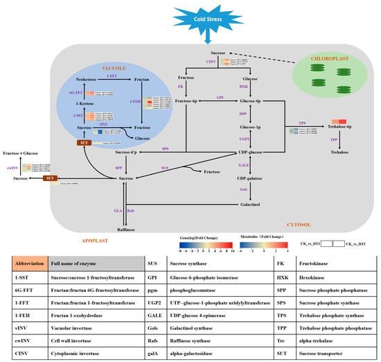 To further study the regulation and adaptation mechanism of sugar metabolism in garlic under low-temperature stress, combined with the analysis results of the KEGG pathway related to sugar metabolism in the transcriptome and metabolome, different carbohydrate metabolism pathway maps were constructed (Figure 11). The results showed, in detail, the carbohydrate metabolism pathway of garlic under low-temperature stress, in which the source and metabolic pathways of carbohydrate metabolites can be clearly understood.