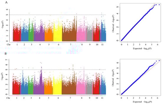 Manhattan and Q-Q plots of GWAS for (A) RGR and (B) RGI. The horizontal dotted lines represent the thresholds for identifying significant SNPs.