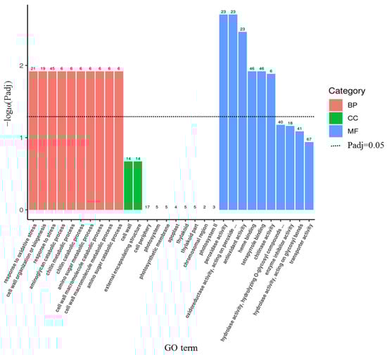 GO functional enrichment analysis of DEGs identified by RNA-seq. Padj represents the adjusted p-value. The number on each bar is the number of DEGs enriched in the corresponding GO term.