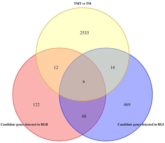 Venn diagram of DEGs identified by RNA-seq and candidate genes detected by GWAS in RGR and RGI.