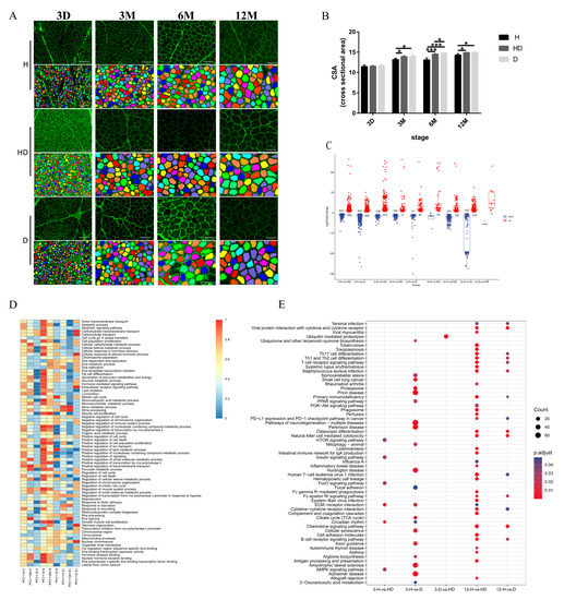 The global gene expression patterns in different sheep breeds (H: n = 6, HD: n = 5, D: n = 3). (A) The skeletal muscle tissues of the 6 H, 5 HD, and 3 D were cross-sectioned and WGA staining was performed, and histological and morphometric analyses were performed. Representative images of H, HD, and D WGA-stained muscle sections (top) and their digitally processed image (Bottom) from D3 to M12. Scale bar: 130 µm. (B) Quantification of average muscle fiber CSA of the three sheep breeds from D3 to M12. * p < 0.05, *** p < 0.0001. (C) The number of upregulated and downregulated differentially expressed genes (DEGs) in the three breeds at the three developmental stages (3 months to 12 months) through pairwise comparisons. (D) The significant pathways of H, HD, and D, which were enriched through GSVA analysis were associated with CSA. (E) KEGG pathways for (Figure S1A): Stage-specific DEGs between breeds from 3 months to 12 months.