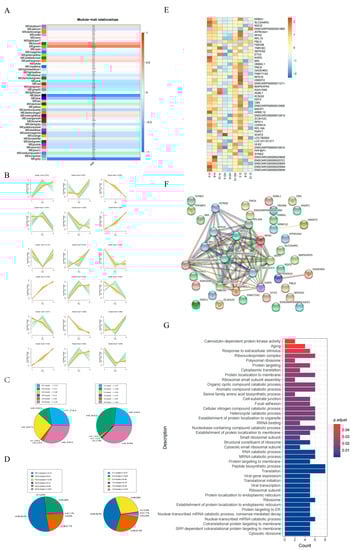 The dynamic transcriptome of skeletal muscle development in different sheep breeds. (A) The 45 modules (gene clusters) were obtained by gene expression and CSA correlation analysis (WGCNA analysis). (B) The genes of the MEgreen and MEblack modules were classified into six patterns according to their expression trends in H, HD, and D, respectively. (C) The genes negatively correlated with CSA in H were distributed in 6 trends in HD or D. (D) The genes positively correlated with CSA in H were distributed in 6 trends in HD or D. (E) Expression profiles of 48 genes (among the three sheep, 48 genes were inconsistent with CSA) in H, HD, and D from 3 months to 12 months. (F) Protein-protein interaction networks of differentially regulated genes were obtained from 48 genes. (G) Functional annotation cluster and gene ontology analysis of the 48 genes.