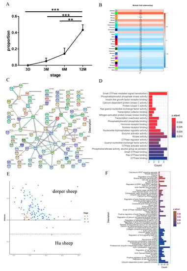The global transcriptomic analysis of muscle fiber hypertrophy. (A) The changes in the proportion of muscle fibers of the CSA were greater than 14.2877 in Hu sheep from 3 months to 12 months. (B) The 26 modules (gene clusters) of the percentage of muscle fibers greater than 14.2877 and gene expression correlation analysis using WGCNA. (C) Protein-protein interaction networks of differentially regulated genes were obtained from 102 genes. (D) The significant GO terms of 102 intersection genes of MEgreen module hub genes and H DEGs from 3 months to 12 months. (E) 110 genes with biased expression. (F) GO items for 110 genes in (E). (n = 6, ** p < 0.001, *** p < 0.0001).