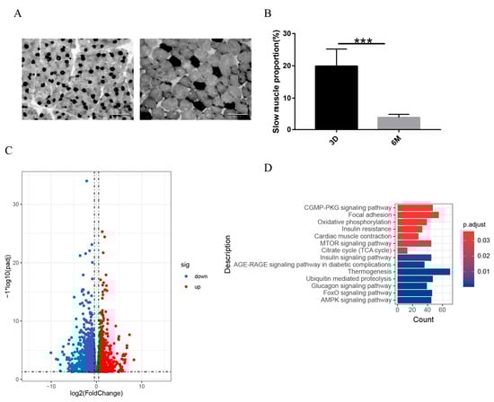 The changes in the transcriptome of the transformation of fast and slow muscles. (A) The distribution of fast and slow muscle fibers in HD muscle. Representative images of fiber types at D3 and M6 are shown, with the “black” areas being the slow-twitch fibers and the “grey” ones being the fast-twitch fibers. (B) Quantification of the proportion of the slow-twitch fibers at D3 and M6 of HD. n = 5, *** p < 0.0001. (C) Volcano plots for the upregulated and downregulated DEGs in the HD at 3 days and 6 months. (D) DEGs are significantly enriched in biological process terms.