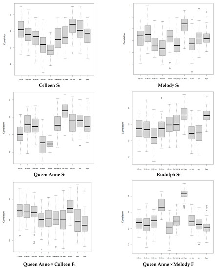 On average, reducing sugars in the tuber flesh, which has a medium-high broad-sense heritability [47], had the second largest r estimate in the S1 offspring or after across-half-sib-family validation using S1 as the training population and F1 as the test population. The r estimates for tuber size uniformity in the S1 and F1 offspring were larger than those of Selga et al. [25] in the advanced breeding population. These r estimates suggest that genomic prediction will be effective for both tuber uniformity traits and for tuber eye depth and reducing sugars in the flesh in S1, although r estimates could vary among the S1 offspring, perhaps due to the genetic background affected by the deleterious mutation load.