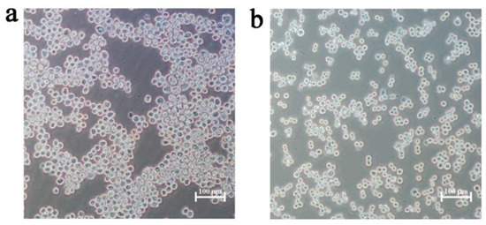 Reverse transcription-PCR was used to amplify up to 1.5 kb DNA fragment (E gene) from the genome of the DTMUV strain YY5 and clone it into the pFastBac1 shuttle vector. The E gene sequence of the recombinant plasmids was confirmed to be correct by DNA sequencing. In Sf9 cells, a recombinant baculovirus known as rBac-E was constructed and propagated. As can be seen in Figure 1, Sf9 cells infected with the baculovirus gradually increased in size, with remarkable morphological changes. These typical cytopathic effects (CPEs) manifested as enlarged round cells with enlarged nuclei that filled the entire cytoplasm and poorly refractive particles in the nuclei, and loose attachment to the culture plate at 3 days post-infection. By using PCR, the recombinant baculovirus was confirmed. The recombinant baculovirus rBac-E was subcultured in Sf9 cells to the 8th generation (titer of TCID50 approximately was 107.17/mL) and then stored at 4 °C for later use.