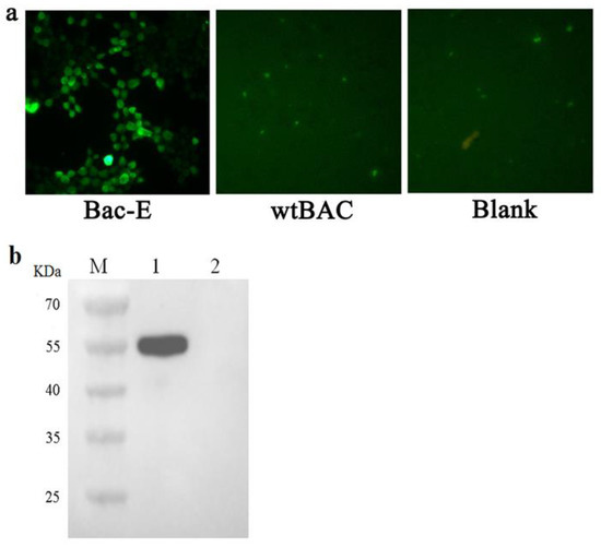 Recombinant baculovirus rBac-E was used to infect the Sf-9 cells at a multiplicity of infection (MOI) of 1 for the expression of the E protein, and wild-type baculovirus was used as a control, respectively. By using a Western blot analysis and an indirect immunofluorescence assay (IFA) 72 h after infection, it was possible to identify the expression of the E protein in SF9 cells. As shown in Figure 2a, bright fluorescence signals could be observed in the cells infected with rBac-E; however, there was no fluorescence signal detected in the cells infected with the wild-type baculovirus. Moreover, a noteworthy band with a molecular weight of about 56 kD was found by Western blot analysis, which was comparable to the size of the target protein. In the meantime, cells infected with wild-type baculovirus showed no protein band (Figure 2b). These findings showed that recombinant baculovirus rBac-E may significantly increase DTMUV E protein expression in Sf9 cells.
