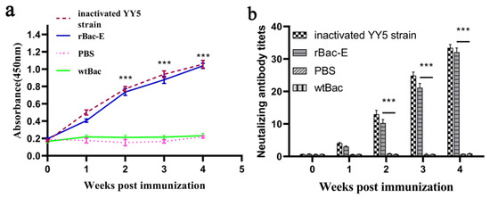 To investigate whether rBac-E could incite the DTMUV-specific immune response in vivo. All ducklings immunized with rBac-E developed specific antibody titers two weeks after the primary immunization, which were significantly higher than those of the Bac-wt and PBS control groups (p < 0.05, Figure 3a). Following booster immunization, the mean antibody level of the rBac-E group significantly increased. A high antibody level was also observed in the group vaccinated with the inactivated vaccine. There was no statistically significant difference between this group and the rBac-E group. None of the ducklings from the negative controls, wtBac and PBS, produced any detectable E-specific antibodies.
