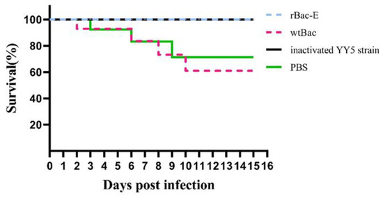 Survival curves of ducklings (n = 10) after challenge. Using the Kaplan–Meier approach, the statistical significance of death rate variations across groups was established and examined with a Log-rank (Mantel–Cox) test. A significant difference between the rBac-E group vs. wtBac or PBS groups, respectively.