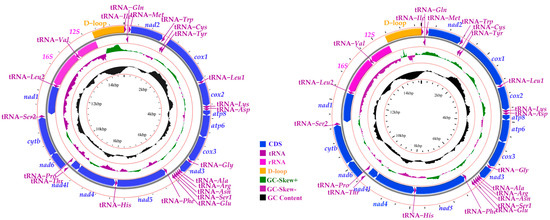 The assembled mitogenome sequence was subsequently annotated using Geneious Prime and the mitogenome of M. protuberanta (GenBank accession number: NC_047465.1) as the reference. All tRNA genes were identified with the MITOS Web Server (http://mitos.bioinf.uni-leipzig.de/index.py, accessed on 12 December 2021) [51]. The annotated mitogenome sequences of S. shinshana and S. bacilla were deposited in GenBank under the accession numbers OM048770.1 and OM048922.1. The typical secondary structures for tRNAs were drawn with Adobe Illustrator 2021 in accordance with the MITOS predictions. The circular mitogenomic maps were visualized with the CGView server (http://stothard.afns.ualberta.ca/cgview_server/, accessed on 12 December 2021). The base composition, codon usage and relative synonymous codon usage (RSCU) of all protein-coding genes (PCGs) were calculated using MEGA 7.0 [52]. Strand asymmetry was calculated using the following formulae: AT skew = (A − T)/(A + T) and GC-skew = (G − C)/(G + C) [53].