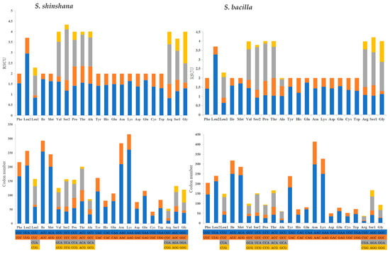 Relative synonymous codon usage (RSCU) and codon number of S. shinshana and S. bacilla.