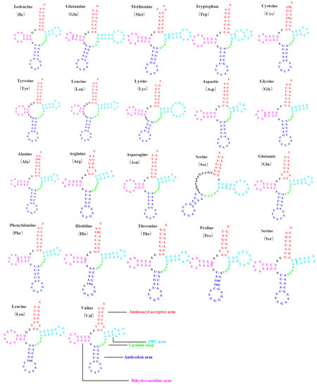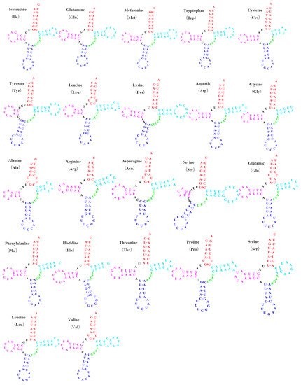 The 16S rRNA gene contained 1186 bp and 1185 bp located between tRNA-Leu2 and tRNA-Val in S. shinshana and S. bacilla, and the 12S rRNA gene comprised 736 bp and 731 bp situated between tRNA-Val and the D-loop in S. shinshana and S. bacilla. The A+T contents of 16S rRNA and 12S rRNA were 83.4%, 85.4% and 81.4%, 80.0%, respectively. Twenty-two tRNA genes from the two species ranged from 61 and 71 bp in both species. Among the 22 tRNA genes, 14 genes are located on the J-strand and 8 genes on the N-strand. This arrangement of tRNA-Ile and tRNA-Gln is common in Cicadellidae, but a few rearrangements of tRNA-Ile and tRNA-Gln have been observed in the mitogenome of other subfamilies of Cicadellidae [6,8]. In insects, most tRNA genes are folded into the typical cloverleaf secondary structure, however, tRNA-Ser1 lacks a dihydrouridine (DHU) arm [61] (Figure 4). Usually, the canonical Watson–Crick base pairings (A–U and C–G) are observed in the tRNA genes, but 16 and 20 noncanonical base pairings (G–U) are found in the DHU arms. The A+T contents in tRNA of S. shinshana and S. bacilla are 79.3% and 77.0% with a positive AT skew (0.06, 0.02) and a negative GC skew (−0.07, −0.04) (Table 4).