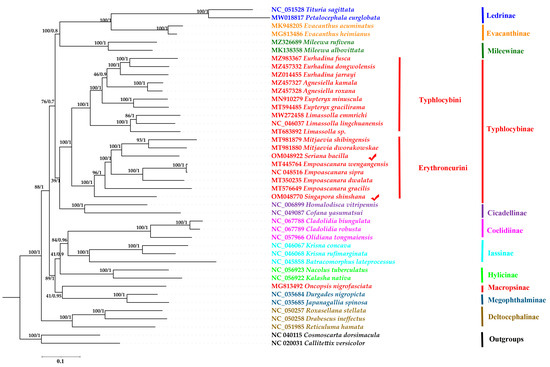 The mitochondrial genome plays a crucial part in the phylogenetic and evolutionary analysis of insects. It is widely used to study genome structure and function, population genetic structure and phylogenetic relationships at various taxonomic levels [6,7,8,9,10,11,12,13]. Recently, it has also been used in the phylogenetic discussion of leafhoppers, including Deltocephalinae, Macropsinae, Megophthalminae, Idiocerinae, Iassinae, Coelidiinae, Ledrinae, Evacanthinae, Cicadellinae, Mileewinae and Typhlocybinae [9,14,15,16,17,18,19]. Guizhou is believed to be one of the most well-developed representative karst regions of south China. Many genera and species of Erythroneurini Young, 1952 were discovered in karst areas in Guizhou [20,21,22,23]. In recent years, the majority of studies have focused on the identification and recording of the genera Singapora and Seriana [24,25,26]. In addition, the seasonal phenology and damage caused by S. shinshana have attracted the attention of many experts [4]. However, the lack of mitogenome sequences for S. shinshana and S. bacilla has limited our understanding of their phylogenetic position within Erythroneurini.