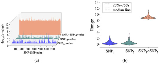 (a) The 3D waterfall plot reveals interaction effects and main effects of each SNP with −log (p-values). The number of significant SNP-SNP pairs was 758. For each interaction pair, the blue waterfall represents main effects of SNP; the green waterfall represents main effects of SNP; and the orange waterfall represents the interaction effects of SNP–SNP pairs. (b) The violin plot shows the distribution state and probability density of SNP-SNP interaction effect, main effect of SNP and SNP.