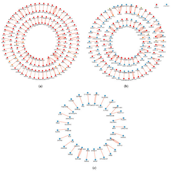 Three categories of different relationships with AD correlation in a gene-gene interaction pair. (a) The 1st relationship, include 95 gene pairs, both genes in each pair are AD-related. (b) The 2nd relationship, includes 79 gene pairs, only one gene in each pair is AD-related. (c) The 3rd relationship, includes 25 gene pairs, none gene in each pair is associated with AD. The red spots represent AD-related genes. The blue spots represent AD-unrelated genes. Multiple lines between two points represent multiple pairs of SNP mapped ont to the same pair of genes.