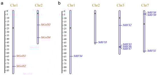 Distribution of the (a) StGolS and (b) StRFS genes on potato chromosomes. The scale bar on the left indicates the length (Mb) of the potato chromosome. The gray oval on the chromosome bar represents the centromere location for each chromosome.