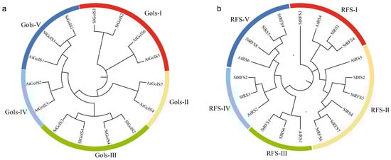 Phylogenetic tree of (a) GolS and (b) RFS proteins identified in potato, tomato, and Arabidopsis. Different subfamilies of GolS and RFS proteins were highlighted by arcs with distinct colors.