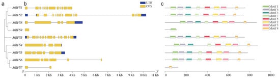 Gene structure of StRFS genes and conserved motif analysis of StRFS proteins. (a) Gene phylogenetic tree; (b) gene structure; and (c) protein conserved motifs of StRFS proteins.
