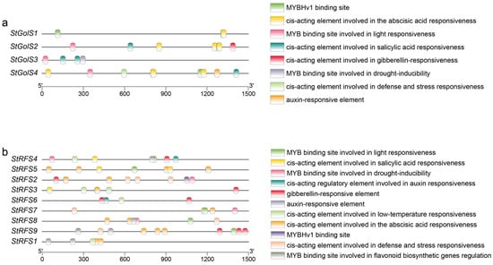 To gain further insights into the potential functions of the StGolS and StRFS genes in potato, an analysis of the cis-acting elements within their promoter regions was conducted. For the StGolS genes, cis-acting elements were predicted in the 1500-bp sequences upstream of the transcription start site (TSS). Some significant cis-acting elements were identified in the promoters of the StGolS genes, including four elements associated with plant hormone responses, three MYB binding sites, and one cis-acting element involved in defense and stress responses (Figure 5a). It should be noted that, except for the StGolS3 gene, multiple cis-acting elements involved in abscisic acid responsiveness were found in the promoter regions of all StGolS genes, suggesting their potential involvement in ABA-mediated processes. The promoter of the StGolS4 gene contained the highest abundance of cis-acting elements, with a maximum of nine, encompassing six different types. Within the cis-acting elements of the StGolS4 gene, there were four cis-acting elements involved in abscisic acid responsiveness and one auxin-responsive element.
