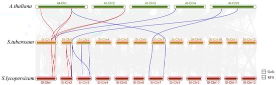 Syntenic relationships of the GolS and RFS genes among Arabidopsis, potato, and tomato. Redlines indicate the homology and evolutionary links of GolS genes, and blue lines indicate the homology and evolutionary links of RFS genes. Gray lines indicate all the syntenic blocks present in their respective genomes. The Arabidopsis chromosome was represented by the green bars, while the potato chromosome was represented by the orange bars, and the tomato chromosome was represented by the red bars.