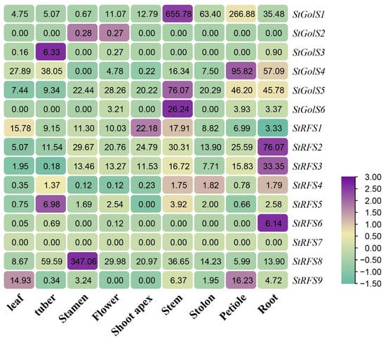 Among the nine StRFS genes, StRFS4 and StRFS7 displayed relatively low expression levels across all tissues. StRFS5 and StRFS6 were solely expressed in tubers and roots, while StRFS9 showed expression in leaves and petioles. StRFS1, StRFS2, and StRFS8 exhibited high expression levels in all tissues (Figure 7). By elucidating the expression profiles of the StGolS and StRFS genes in diverse tissues, our analysis provides valuable insights into their tissue-specific functions in potato development.