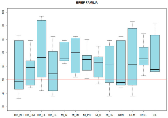BRIEF-2 RESULTS (family). BRI_INH: inhibition. BRI_SMI: supervision. BRI_FL: flexibility. BRI_CE: emotional control. MI_IN: initiative. MI_MT: working memory. MI_PO: planning-organization. MI_S: supervision. MI_OR: material organization. IRCN: index of behavioral regulation. IREM: emotional regulation index. IRCG: index of cognitive regulation. IGE: global index of executive function.