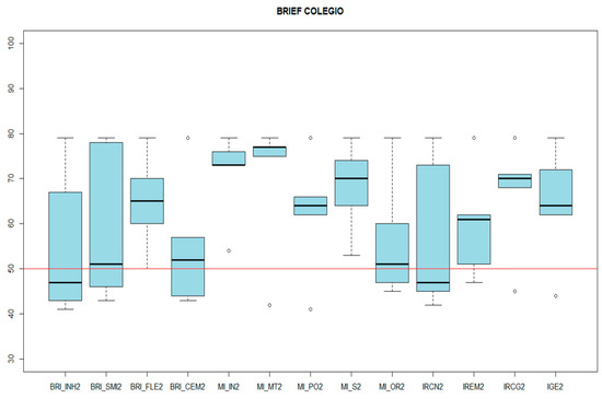 BRIEF-2 RESULTS (school). BRI_INH2: inhibition. BRI_SMI2: supervision. BRI_FLE2: flexibility. BRI_CEM2: emotional control. MI_IN2: initiative. MI_MT2: working memory. MI_PO2: planning-organization. MI_S2: supervision. MI_OR2: material organization. IRCN2: index of behavioral regulation. IREM2: emotional regulation index. IRCG2: index of cognitive regulation. IGE2: global index of executive function.