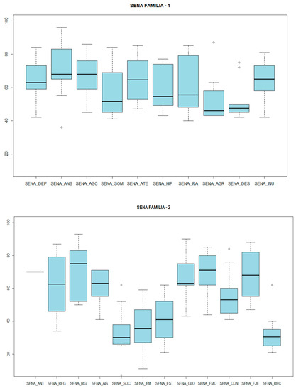 SENA RESULTS (family). SENA_DEP: depression. SENA_ANS: anxiety. SENA_ASC: social anxiety. SENA_SOM: somatic complaints. SENA_ATE: attention problems. SENA_HIP: hyperactivity-impulsivity. SENA_IRA: anger control problems. SENA_AGR: aggression. SENA_DES: defiant behavior. SENA_ANT: antisocial behavior. SENA_INU: unusual behavior. SENA_REG: emotional regulation problems. SENA_RIG: rigidity. SENA_AIS: isolation. SENA_SOC: integration and social competence. SENA_IEM: emotional intelligence. SENA_EST: willingness to study. SENA_GLO: global problem index. SENA_EMO: emotional problems index. SENA_CON: behavioral problems index. SENA_EJE: index of executive functioning problems. SENA_REC: index of personal resources.