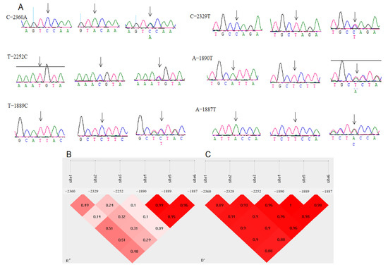 Six single nucleotide polymorphisms identified in the promoter region of the MMP13 gene (A), The R2 map (B), and the D map (C) of linkage disequilibrium in chickens. With D > 0.75 and R2 > 0.33, there is a linkage disequilibrium, the arrow points to the mutation site.