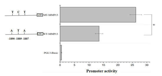 3.5. The Effect of SNPs on the Promoter Activity of the MMP13 Gene