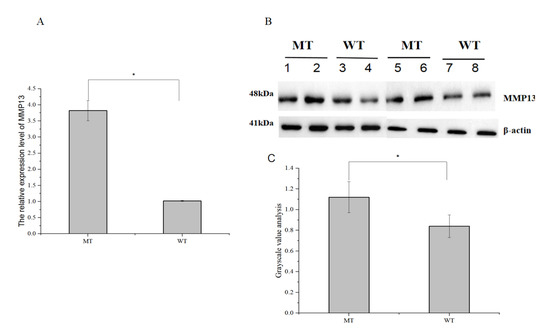 To study the effect of mutations occurring at different sites of the MMP13 promoter on gene expression, quantitative detection of the expression level of the MMP13 gene was carried out. The results showed that the relative expression level of the MMP13 gene in the ovarian tissues of the MT individuals (T-1890/C-1889/T-1887) was higher than that of the WT individuals (A-1890/T-1889/A-1887). The results of Western blotting were consistent with the above results, i.e., the protein expression level of the MMP13 gene in MT was higher than in WT (Figure 3). Together, all the results further verified our speculation that the promoter mutation site might affect the expression of the MMP13 gene.
