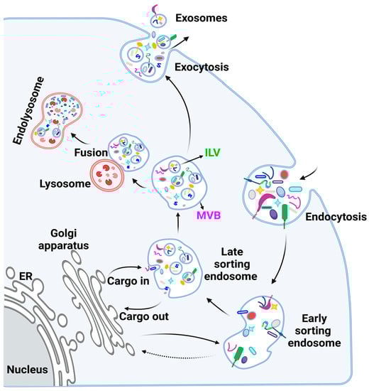 The biogenesis of exosomes is strictly regulated such that every step of EV formation is directed by specific components (Figure 2). Exosome biogenesis starts with the formation of an early endosome that matures into a late endosome [61,62]. During endosomal maturation, ILVs are formed via endosomal sorting complex required for transport (ESCRT)-dependent and independent machinery [36,63]. The late ILV-containing endosomes are referred to as multivesicular endosomes (MVEs) or multivesicular bodies (MVBs). The ILVs that eventually become exosomes harbor specific proteins and nucleic acids that are stochastically acquired and/or sorted cytoplasmic and membrane-bound contents originating from processing steps within the donor cell [64,65,66].